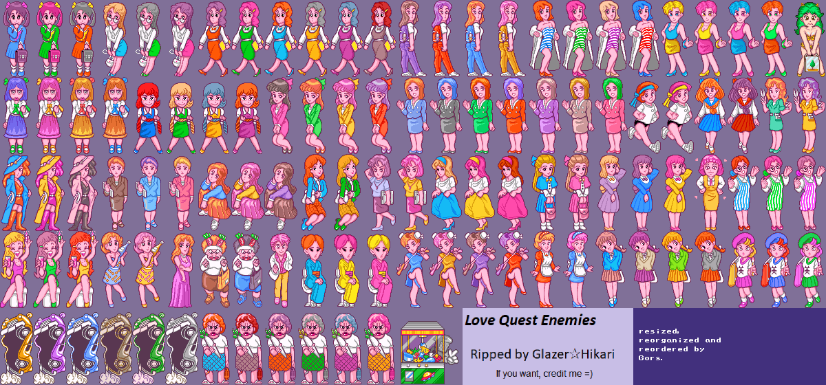 I have played this game to check if the sprites were scaled up to 2x as the ripper claimed and according to those screenshots I took, the sprites are clearly displayed as 1x: https://imgur.com/a/SSluCKn . I also reorganized he sprites to fit a 8x8 grid and reordered the characters to a more "user-friendly" way. I suspect that there are many more palette variants for them considering some have up to 6 or 7 versions while others only have 1.