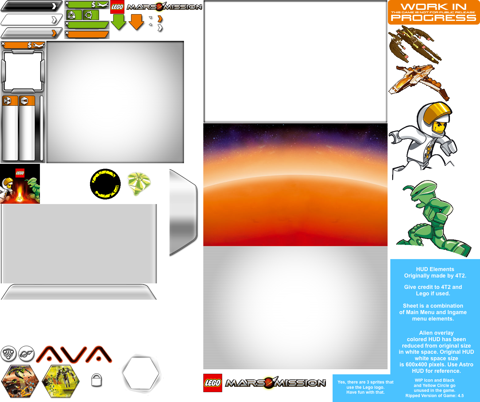 The HUD was split into several parts to be used as overlays over the main 'astro' HUD element. In the game, the alien's side would show the green elements over the astro one (originally having too much wasted white space in the sprite). The 'WIP' sprite was used for internal versions, likely never seen until the flash game was ripped and assets from the developers were shown to specific people here and there. These sprites came from the game itself. The yellow and black sprite was used for a temp. overlay showing 'Aliens Side Coming Soon' or something similar, which was removed when the alien's story mode came out years ago (most old sprites from certain versions remain in the 'hive edition'). The hive sprites are in-fact real, and have been uploaded on this website; check them out here: https://www.spriters-resource.com/browser_games/legomarsmissioncrystalienconflict/sheet/144307/