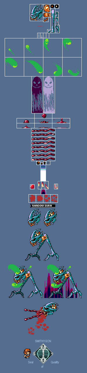 Shadow Eura was an evil alien who arrived on a giant meteor that crashed into the World Tree. He operates from his lair in the Upper Branches and mutated the dwarves into monsters. You fight him at the altar of the meteor deep in his ruined castle. Pieces, rotating spirits, shadow pillar (would randomly pop out of the ground when Eura would stop the ground), gore ball, gore splatter, intestines, rock debris, shockwave, fireball spell (Firaga), evil aura, blood splatter. Very gory, eh?