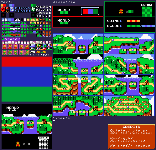 why does a game like this NEED a "world map?" The experience feels, to me, cohesive and bigger without one, and you can only go in one direction anyway. The colors and geographical features are monotonous, with that same shade of green in all of them, despite the actual levels lacking grass (I assume that is grass) entirely. The graphics appear to be well extracted, though.