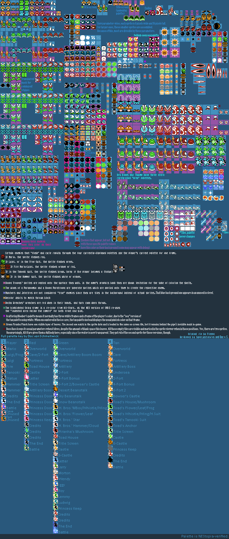 Revision sent: Color check (now uses accurate NEStopia palette), included all possible palette cycle flashes. Added Scattering Blooper/Bloober and palette notes for it. Also included Goombas, Troopas, and Buzzy Shell seen on the title screen sequence.