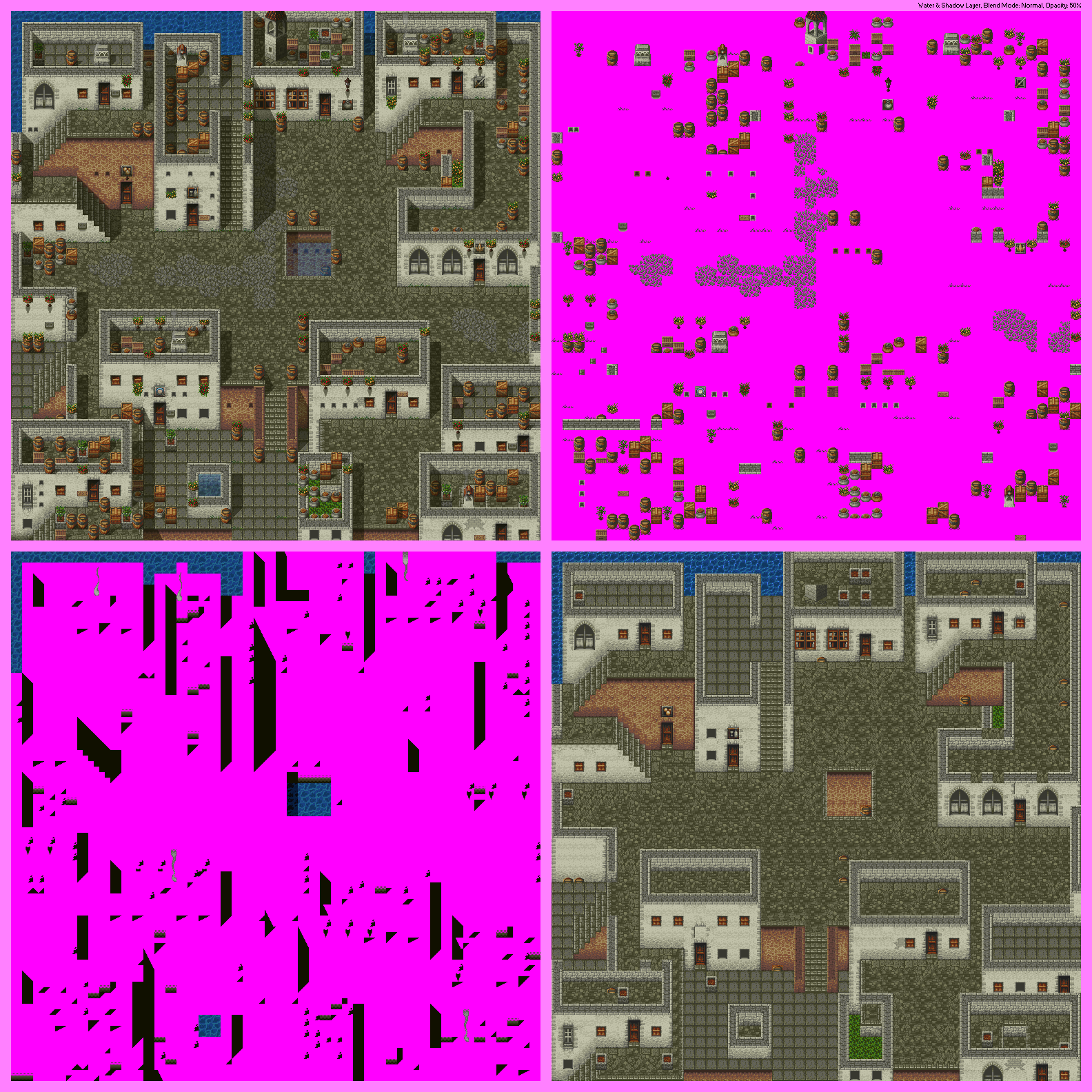 Ingame tile priorities: house with magnifying glass sign has a bowl with orange flowers (upper layer), whose top is cut off by the lower layer.